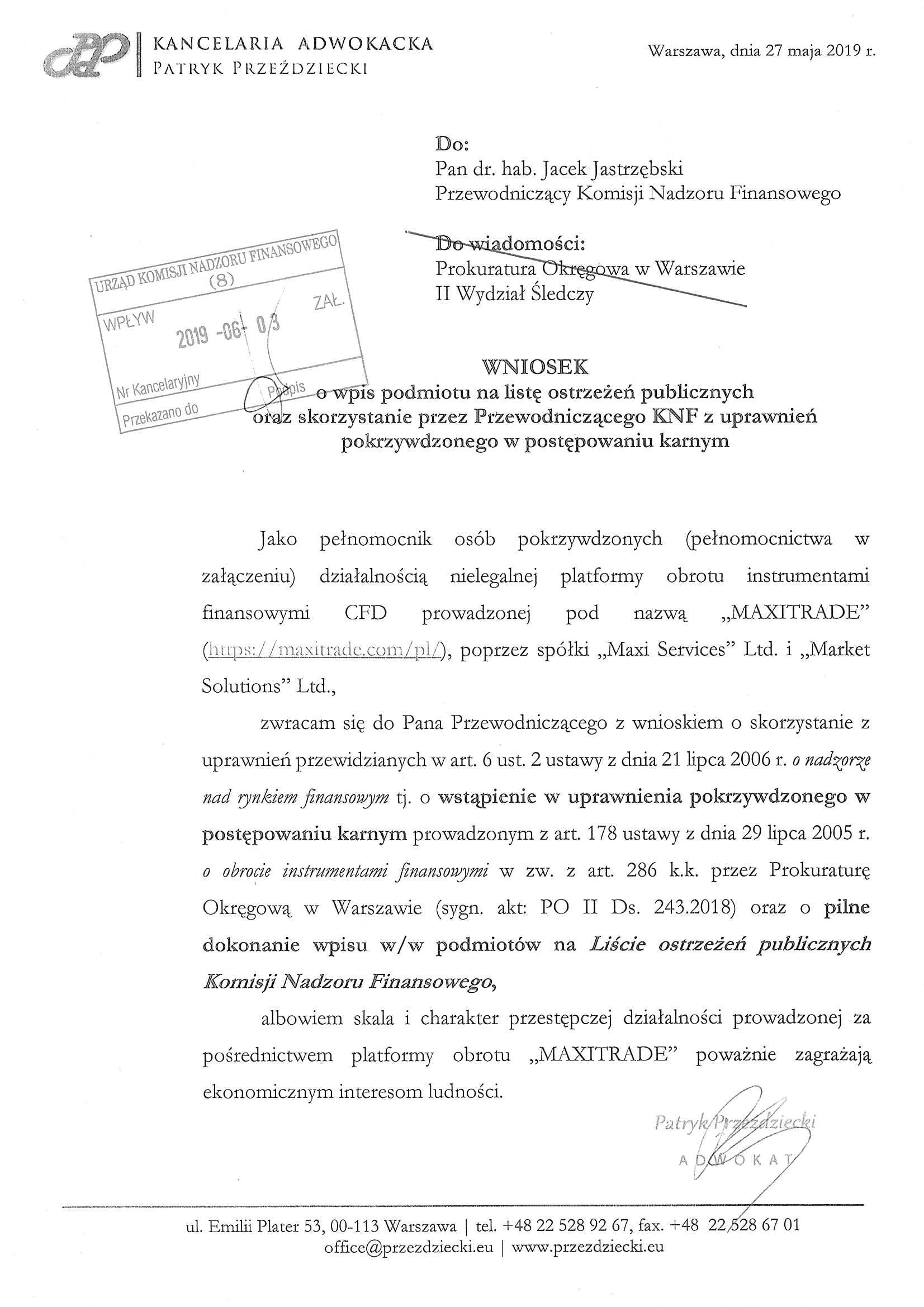 Informujemy, iż na wniosek Kancelarii firma para-inwestycyjna „MAXITRADE” (www.maxitrade.com) została w dniu dzisiejszym umieszczona na Liście Ostrzeżeń Publicznych KNF, zaś Przewodniczący KNF Jacek Jastrzębski na mocy przyznanych mu uprawnień przystąpił do wszczętego już śledztwa w charakterze pokrzywdzonego.